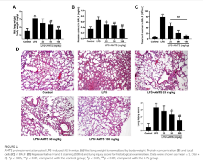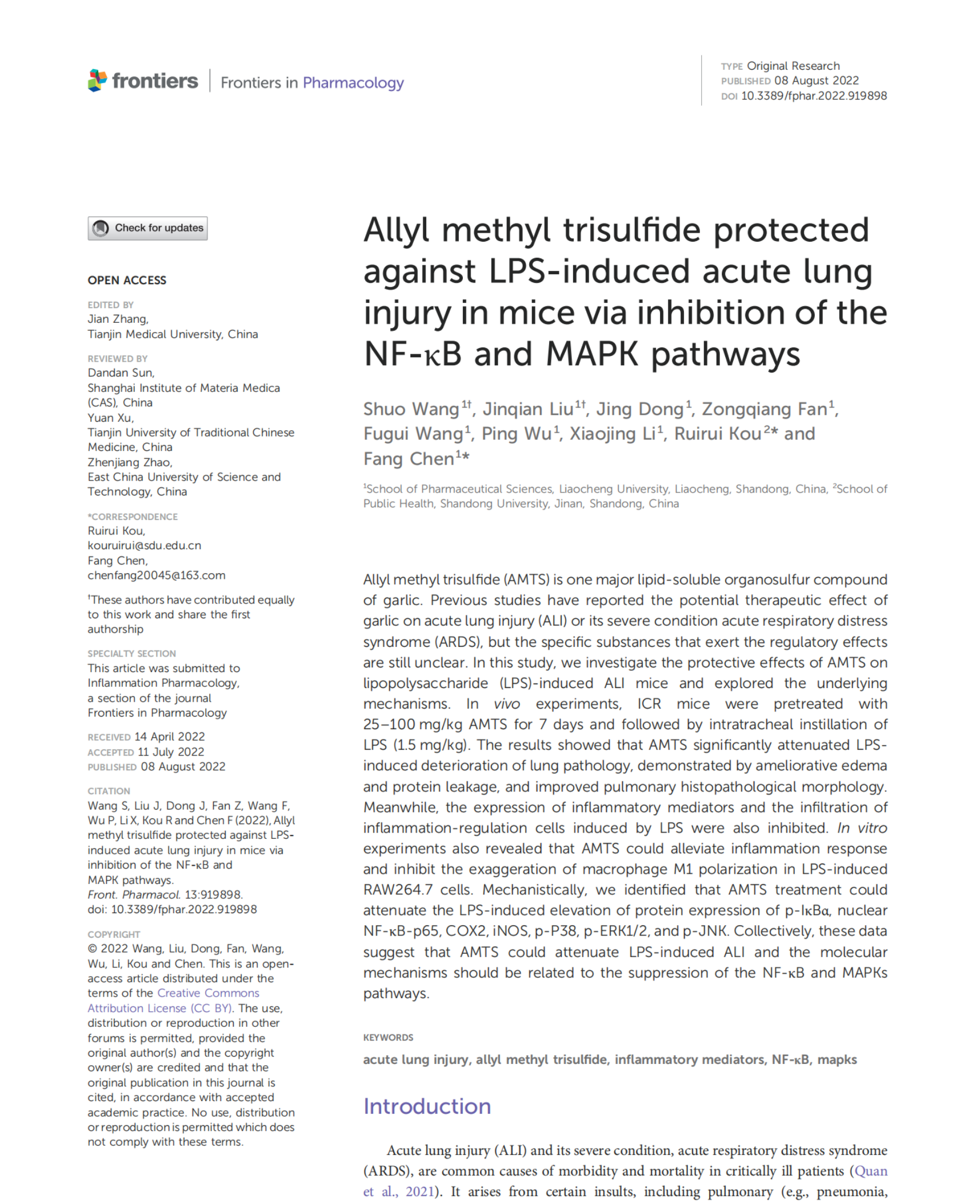 近日,药学院合成生物学与化学生物学创新团队的陈芳教授和王硕博士在《Frontiers in Pharmacology》杂志(中科院二区Top,IF=5.988)发表以“Allyl methyl trisulfide protected against LPS-induced acute lung injury in mice via inhibition of the NF-κB and MAPK pathways”为题的研究成果。王硕博士、硕士生刘晋倩为本论文的共同第一作者,陈芳教授和山东大学寇蕊蕊教授为共同通讯作者,韦德国际bv1946为第一署名单位。