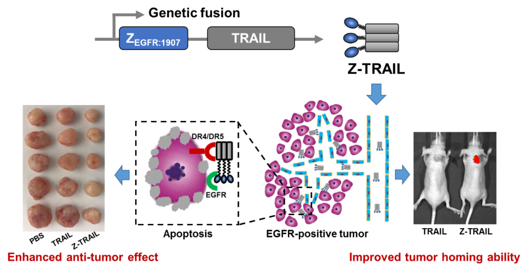 综上所述,本研究将拮抗EGFR的亲合体与TRAIL融合,赋予了TRAIL对EGFR阳性肿瘤的靶向性,显著提升了TRAIL的体内外抗肿瘤作用。获得的Z-TRAIL蛋白分子具有一定的应用前景。