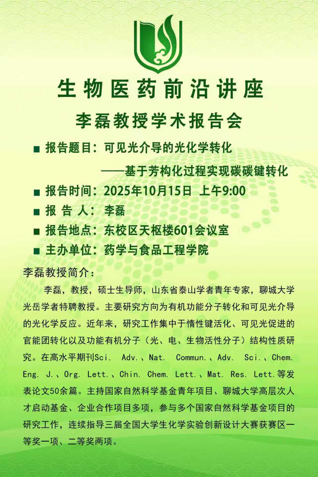 2025年10月15日,我院于东校区天枢楼# 601举办“可见光介导的光化学转化——基于芳构化过程实现碳碳键转化”主题学术报告会。李磊教授在报告中阐述了可见光介导光化学反应的研究成果,聚焦惰性键活化、可见光促进的官能团转化等关键方向,为有机功能分子转化领域的研究与应用开拓了新的路径,相关研究已在高水平期刊发表多篇成果。