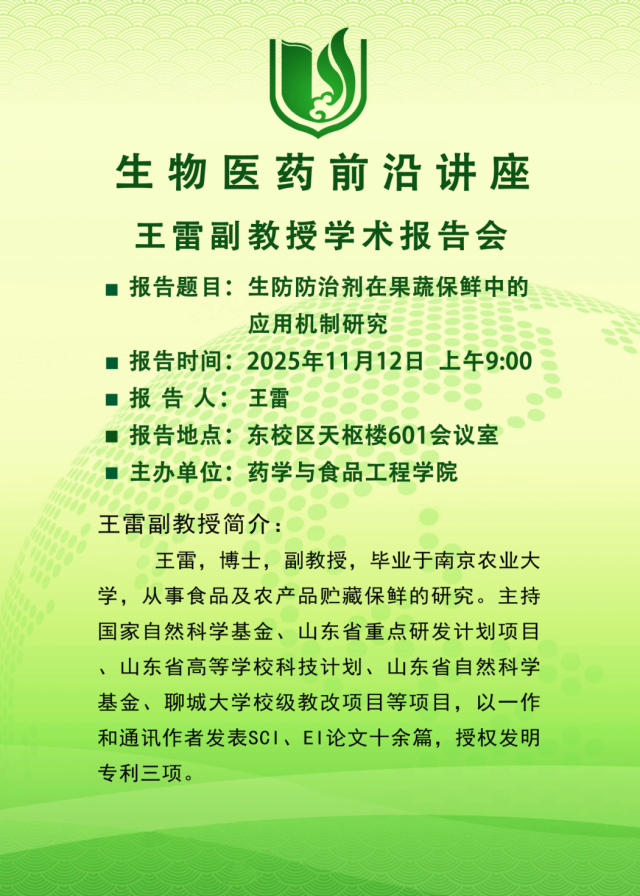 2025年11月12日,我院于东校区天枢楼# 601举办“生物防治剂在果蔬保鲜中的应用机制研究”主题学术报告会,王雷副教授介绍了生防菌及其代谢产物可通过抑制致病菌增殖、调控果蔬采后生理等方式延长保鲜期,其研究成果为果蔬绿色保鲜技术的产业化应用提供了理论支撑,也为减少农产品采后损耗提供了新方案。