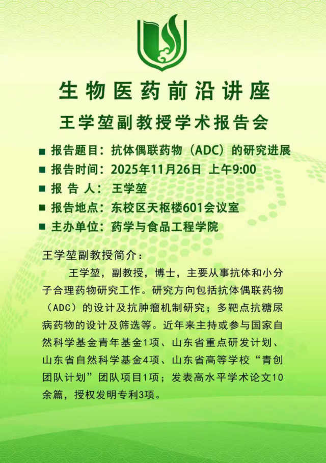 2025年11月26日,我院于东校区天枢楼# 601举办“抗体偶联药物(ADC)的研究进展”主题学术报告会,王学堃副教授解析了ADC通过靶向递送细胞毒药物实现精准抗肿瘤的作用机制,同时介绍了其团队在ADC结构优化与靶点筛选中的最新成果,为抗体药物的研发与临床转化提供了新的思路与参考。