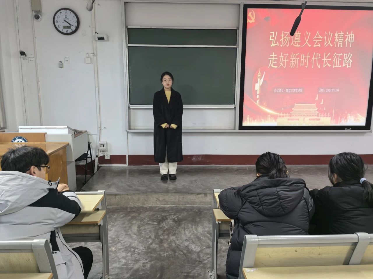 活动伊始,主讲人孙倩茹以时间为轴,带领同学们回顾了遵义会议召开的历史背景,阐述了遵义会议召开的紧迫性与必要性,使同学们领悟到了中国共产党在生死攸关之际的智慧与勇气。随后主讲人详细阐述了以“坚定信念、坚持真理、独立自主、团结统一”为基本内涵的遵义会议精神。她表示,这些精神品质不仅在当时具有重要意义,更激励着新时代青年继续前行,为实现中华民族伟大复兴的中国梦贡献自己的力量。