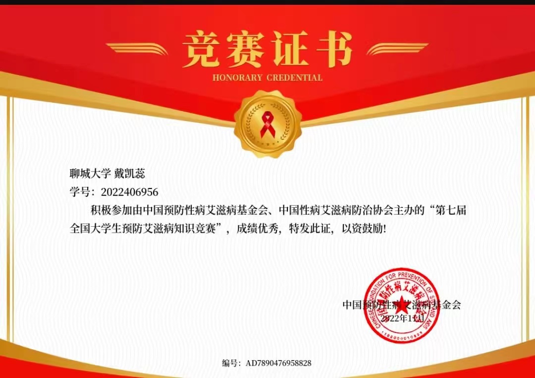 热烈祝贺药学院戴凯蕊荣获“第七届全国大学生预防艾滋病知识竞赛”优秀奖
