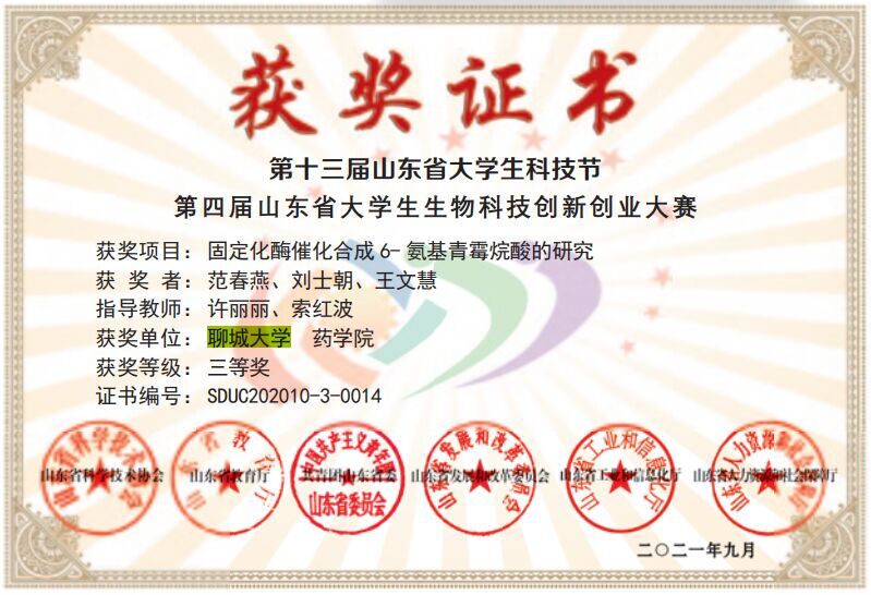 热烈祝贺药学院刘士朝荣获第十三届山东省大学生科技节第四届山东省大学生生物科技创新创业大赛三等奖