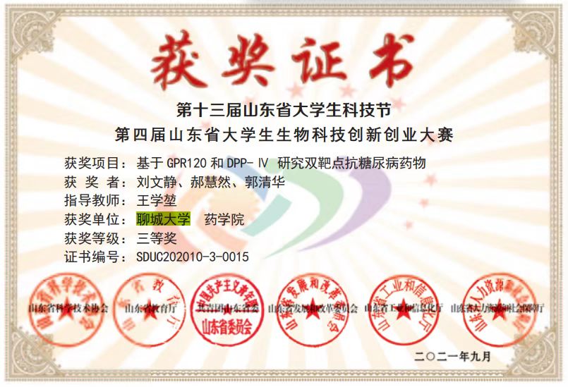 热烈祝贺药学院刘文静荣获第十三届山东省大学生科技节第四届山东省大学生生物科技创新创业大赛三等奖