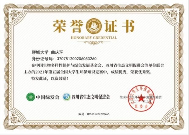 热烈祝贺药学院曲庆环荣获“环保知识竞赛优秀奖”