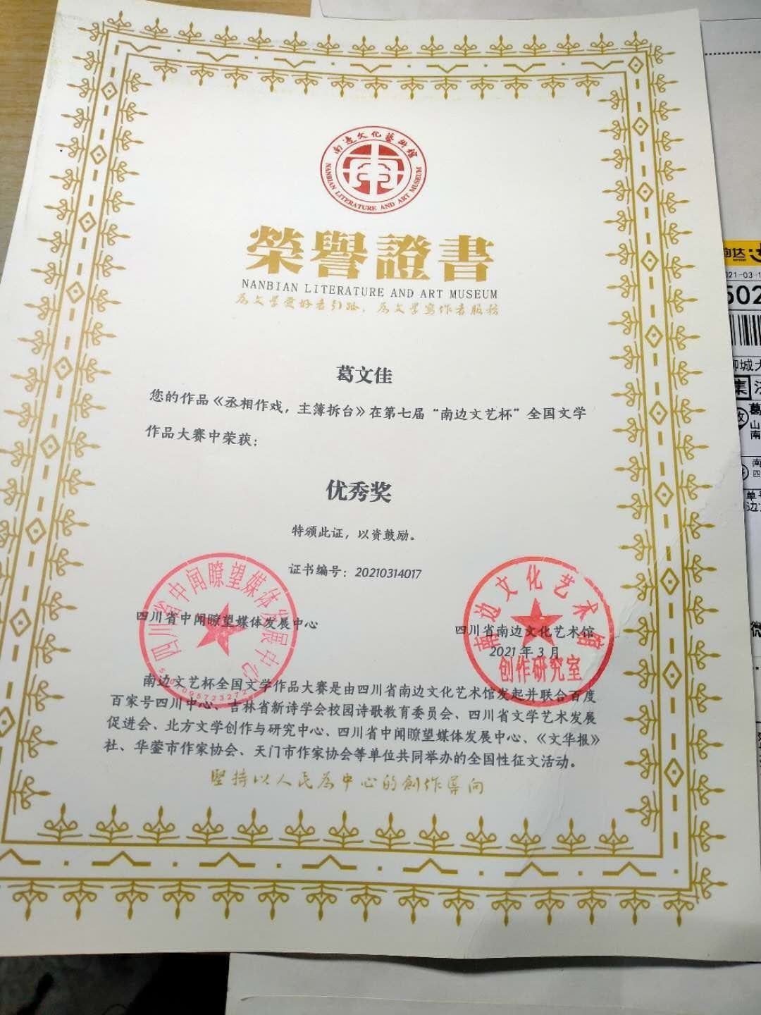 热烈祝贺药学院葛文佳荣获第七届“南边文艺杯”全国文学作品大赛优秀奖