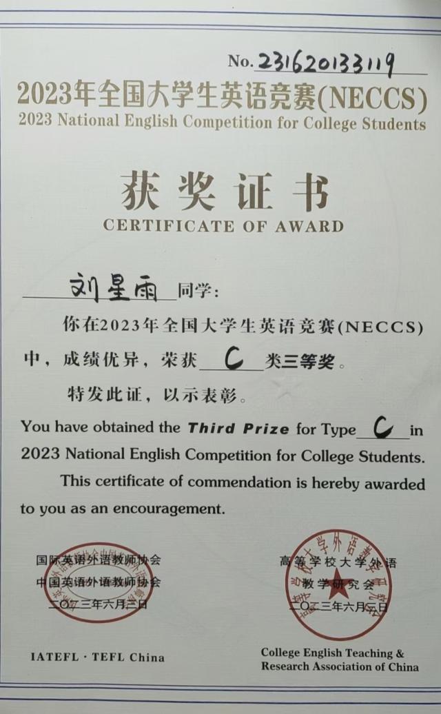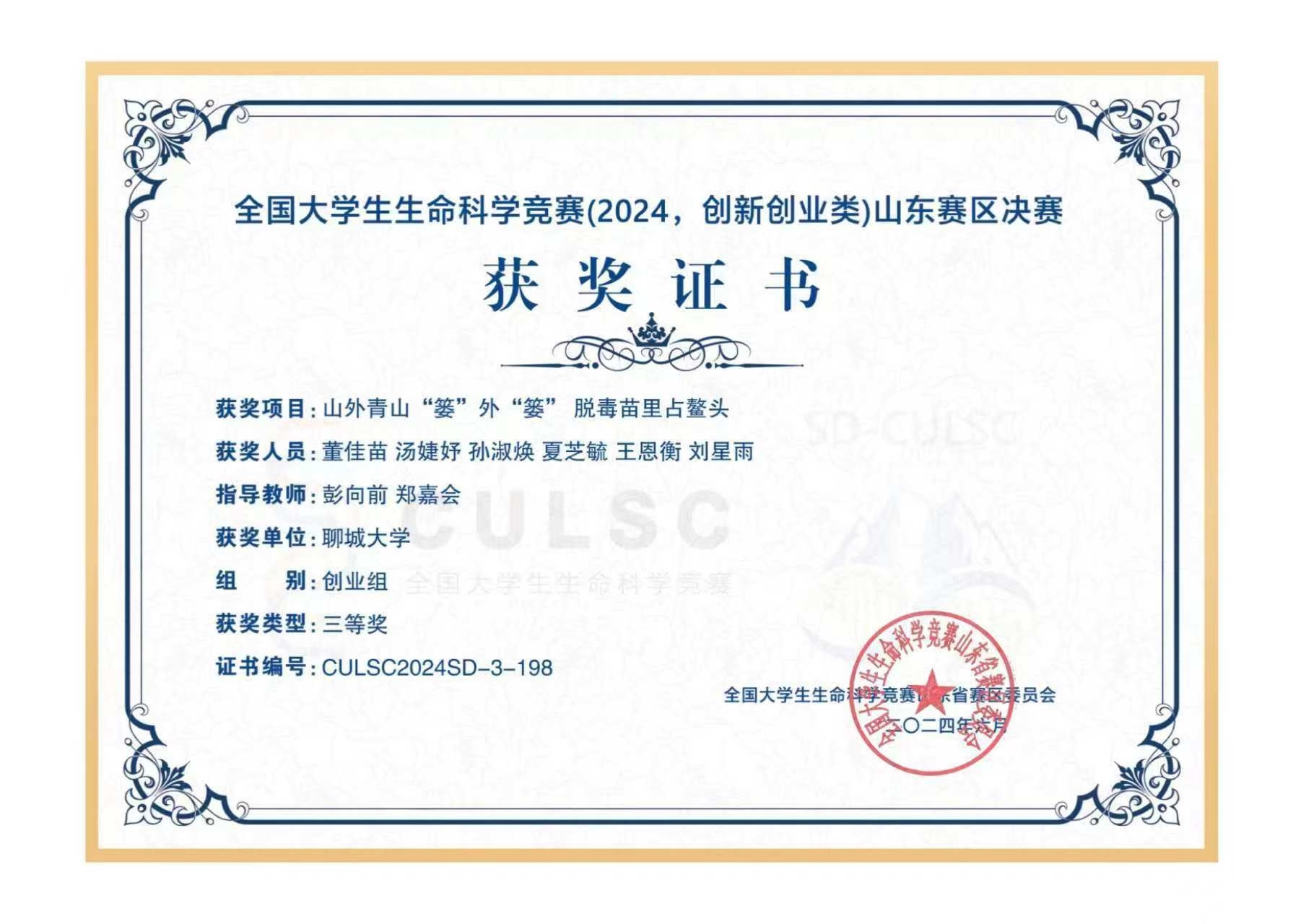热烈祝贺伟德国际victor1946刘星雨荣获全国大学生生命科学竞赛(2024,创新创业类)山东赛区决赛三等奖