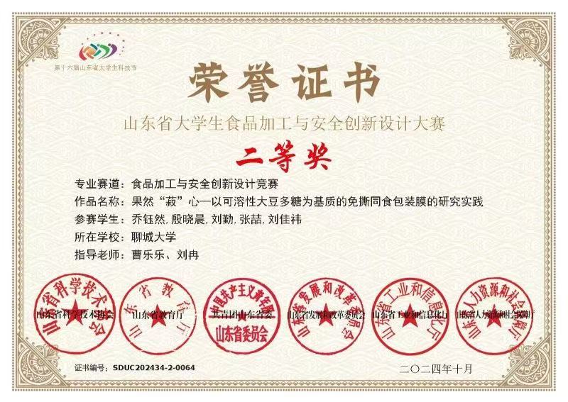 热烈祝贺伟德国际victor1946刘勤荣获山东省大学生食品加工与安全创新设计大赛二等奖