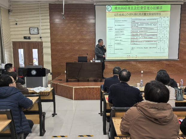 会上,王长征系统解读了横向科研项目经费管理办法,围绕项目范围界定、合同签订规范、经费使用细则及激励措施等内容详细说明。蔡伟针对科技成果转化政策,详细阐释了收益分配和校企协同创新机制。学院副院长刘国运对专业技术岗位竞聘和聘期考核有关政策进行了详细解读,从教学成果、科研突破、社会服务等维度解析竞聘条件和考核指标。
