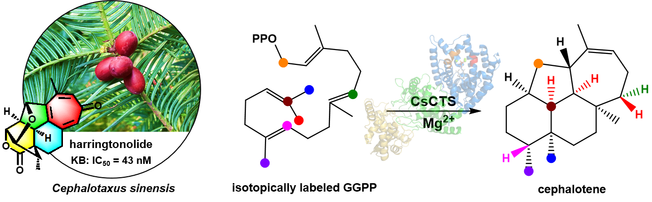 近日,我院王帅博士与中国医学科学院药物研究所戴均贵研究员团队合作以共同第一和通讯作者身份在国际顶级化学期刊Angewandte Chemie International Edition (Top Journals,IF: 16.6)在线发表了题为“Functional Characterization and Cyclization Mechanism of a Diterpene Synthase Catalyzing the Skeleton Formation of Cephalotane-type Diterpenoids”的研究论文。该研究发现并功能鉴定了三尖杉烯合酶CsCTS,首次明确了海南粗榧内酯等三尖杉烷型二萜前体为三尖杉烯(cephalotene),并阐明了其环化机制。