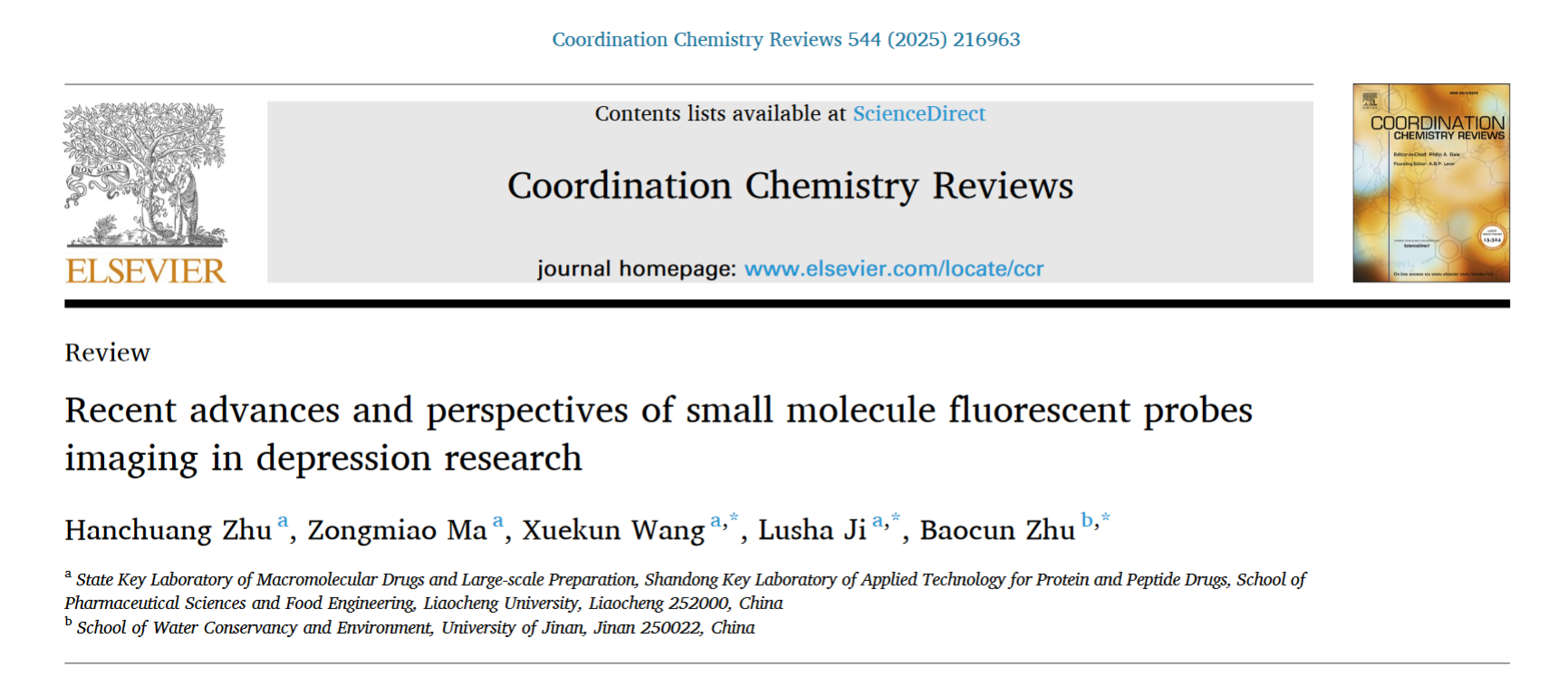 近日,我校重大疾病治疗药物靶点研发团队在化学领域国际顶级期刊《Coordination Chemistry Reviews》(中科院一区,影响因子23.5)发表题为《Recent advances and perspectives of small molecule fluorescent probes imaging in depression research》的综述论文。该研究系统总结了小分子荧光探针技术在抑郁症机制研究与临床诊疗中的前沿进展,为推动小分子荧光探针技术在抑郁症精准诊断中的临床转化应用提供了重要理论支持。