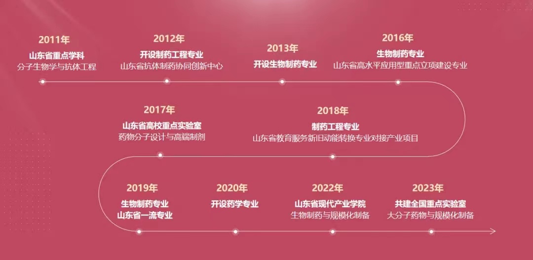 2010年,韦德国际bv1946与抗体药物与靶向治疗国家重点实验室和上海张江生物技术有限公司共同创建韦德国际bv1946药学院。2012年制药工程专业获批招生,2013年生物制药专业成功获批,在此基础上于2020年申请获批药学专业。学院先后获批山东省省级重点学科“分子生物学与抗体药物工程”(2012年),韦德国际bv1946重点建设项目“单克隆抗体药物工程”(2012年),山东省抗体制药协同创新中心(2013年),山东省高水平应用型重点立项建设专业(2016年),山东省药物分子设计与高端制剂重点实验室(2017年),2019年韦德国际bv1946生物制药专业成功获批山东省一流专业建设点,制药工程专业获批“山东教育服务新旧动能转换专业对接产业”项目1项。2022年成功组建并获批山东省“生物制药及规模化制备现代产业学院”。2023年我校作为共建单位获批“大分子药物与规模化制备全国重点实验室”