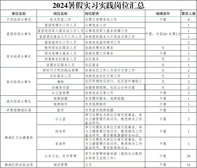 报名方式:公益实习实践岗报名,填写报名表后,请将报名表发送至安丘团市委邮箱tw43965492024@163.com,邮件标题统一格式为“报名单位+学校+姓名”。每人仅可投递一次简历,请确认无误后投递。报名截止后,符合要求的将通过电话、短信和微信等形式进行通知,请同学们耐心等待,保持通讯畅通。
