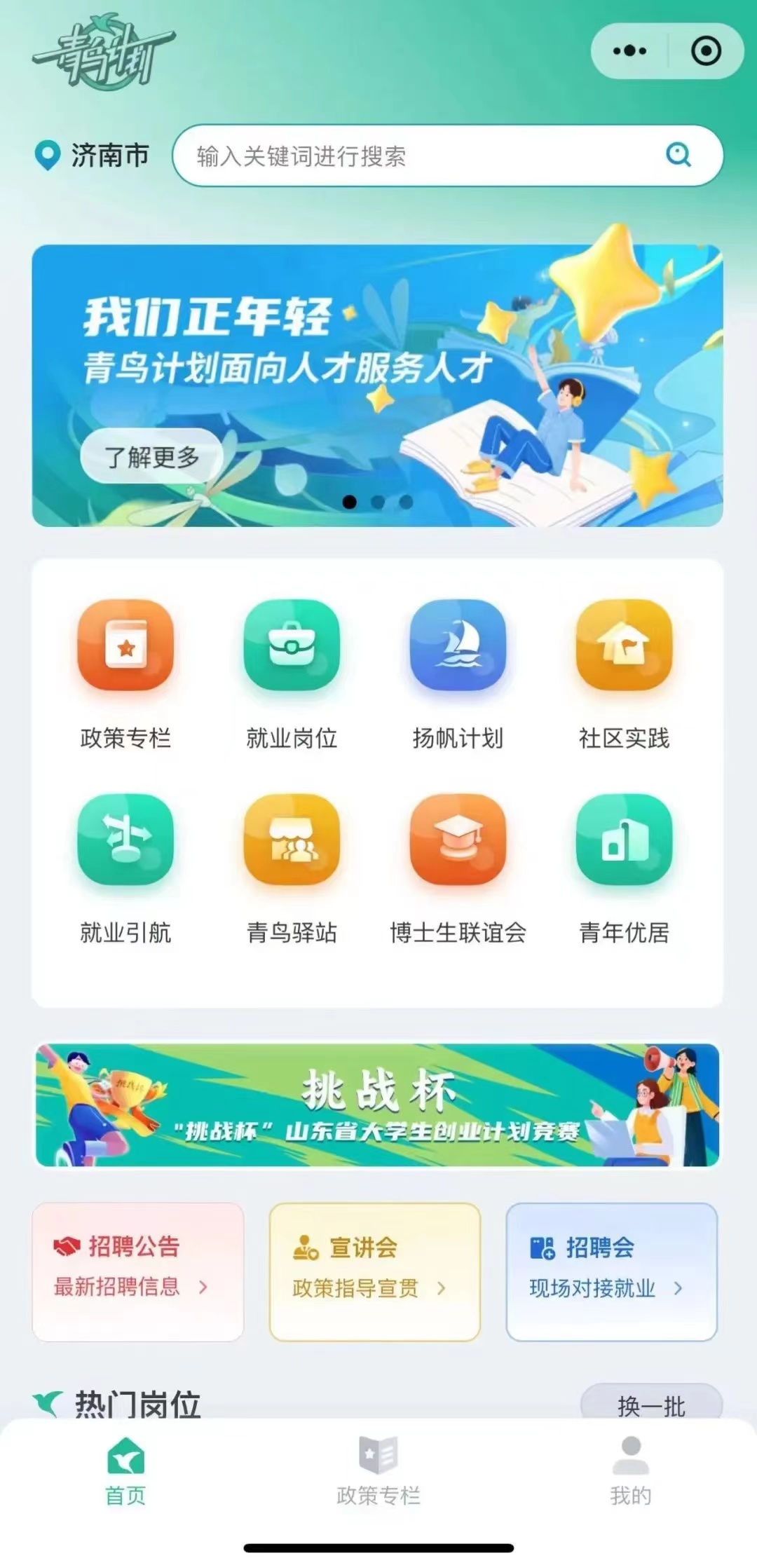 1.首先进入青鸟计划小程序,点击首页——下拉热门岗位,点击“实践信息”寻找令你心动的岗位。